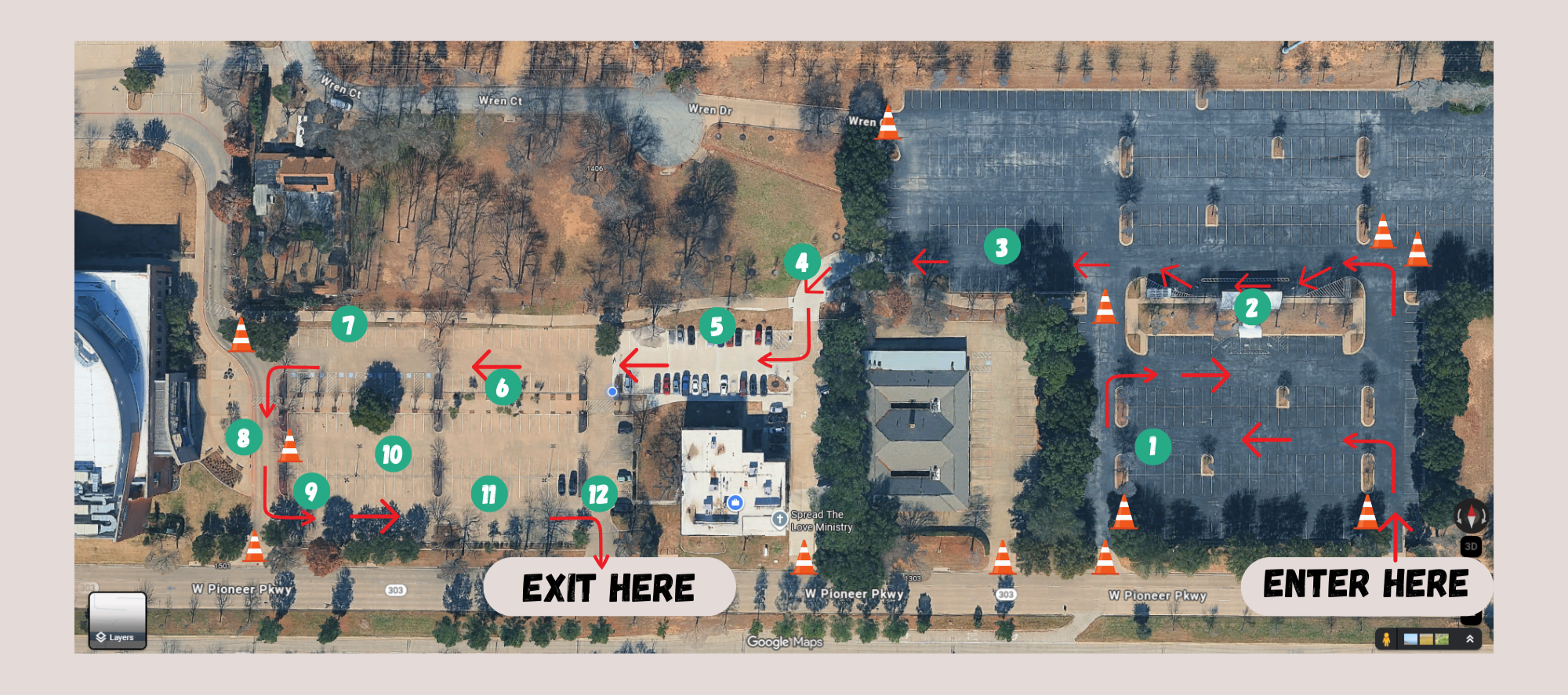 Enter into the remote parking lot of the Pioneer Campus off of Pioneer Parkway.